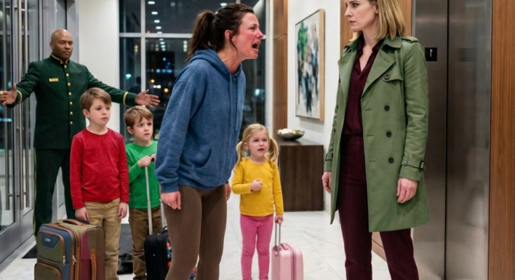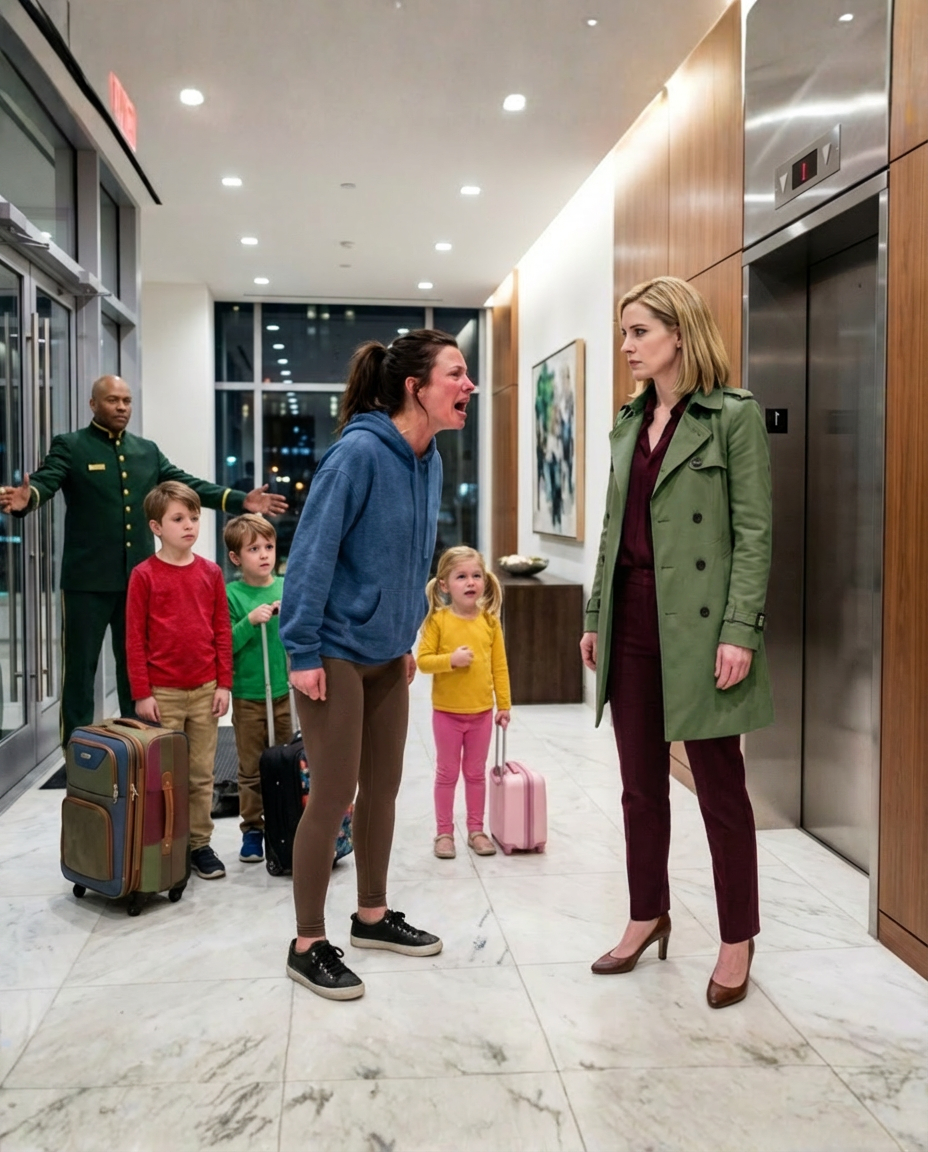 Just before 1 a.m., Vanessa arrived with her three exhausted children and a pile of luggage. When the doorman stopped her, she was shocked—until she saw Emily standing nearby.