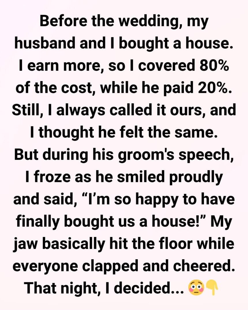 Everything was perfect on our wedding day—until his groom’s speech. I froze when he smiled proudly and said, “I’m so happy to have finally bought us a house!” My jaw practically hit the floor as everyone clapped and cheered. That night, I didn’t want to ruin our special day, so I decided to let it go and talk about it later.