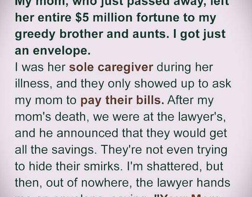 The lawyer’s voice was cold and final: my mom’s entire $5 million estate was to be divided between my brother and aunts. I sat frozen, my heart breaking as they exchanged smug glances, some even smirking. I had given her everything—my time, my love, my strength—and in return, nothing. Or so I thought. Just before I could crumble completely, the lawyer handed me a sealed envelope, my name written in her flowing handwriting.