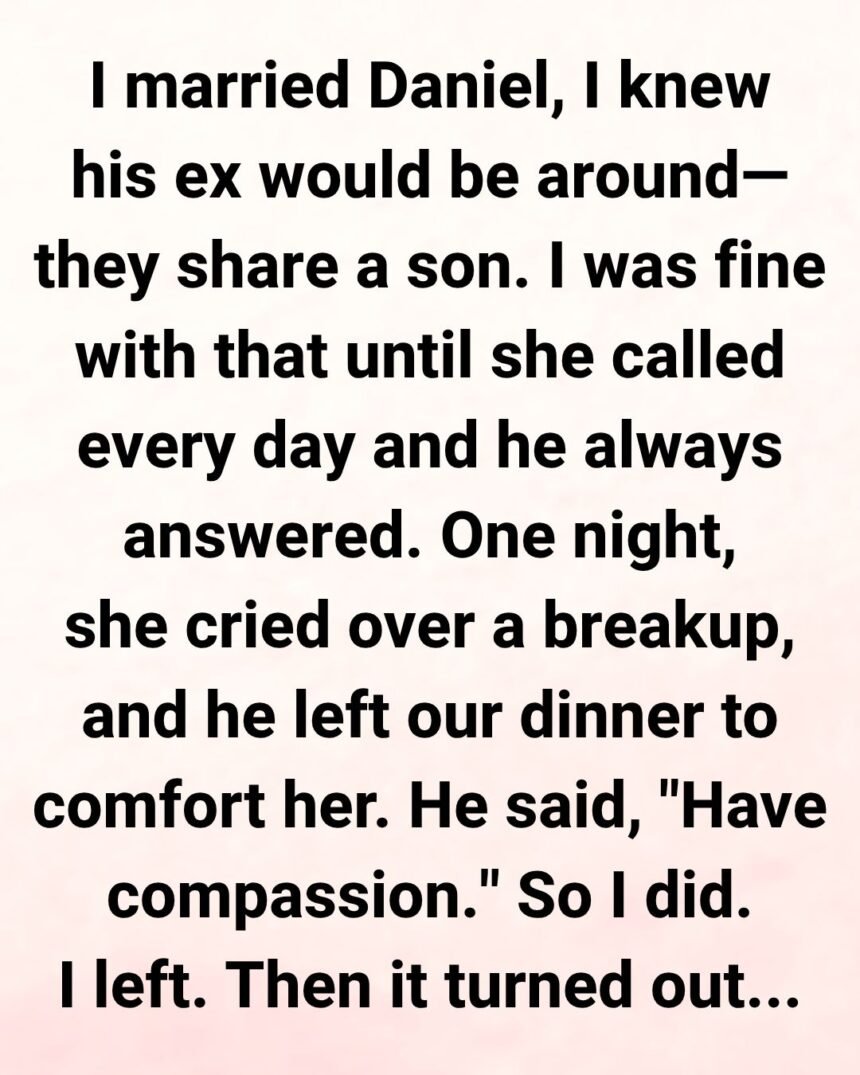 That’s when everything became painfully clear. Compassion wasn’t the problem — respect was. And in that moment, I realized I wasn’t just sharing my husband with his past; I was competing with a woman who no longer wore his ring but still somehow held all the power over him.