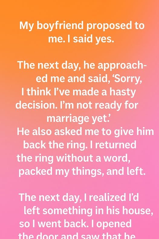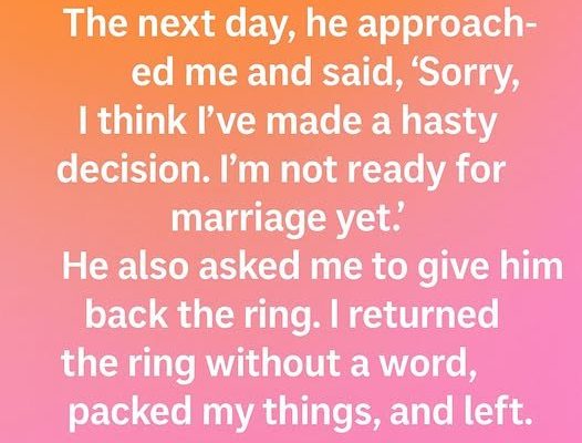 The next day, he approached me and said, “Sorry, I think I’ve made a hasty decision. I’m not ready for marriage yet.” His voice shook as if he was unsure of his own words, but they landed like stones in my chest. He asked for the ring back.