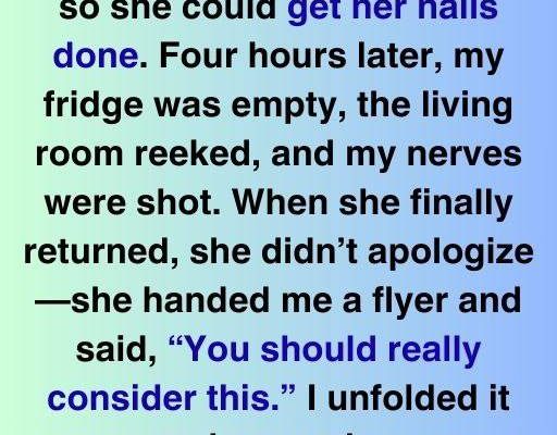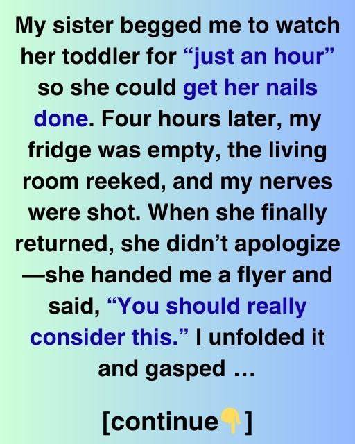 My sister asked me to watch her kid for “just an hour” so she could get her nails done. Four hours later, my fridge was empty, the living room smelled, and I was nervous.