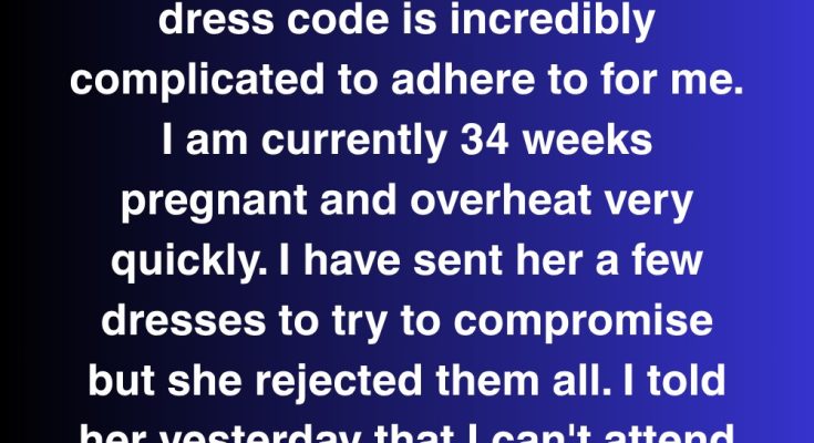 I am currently 34 weeks pregnant and overheat very quickly. I have sent her a few dresses to try to compromise but she rejected them all. I told her yesterday that I can’t attend her wedding and she…