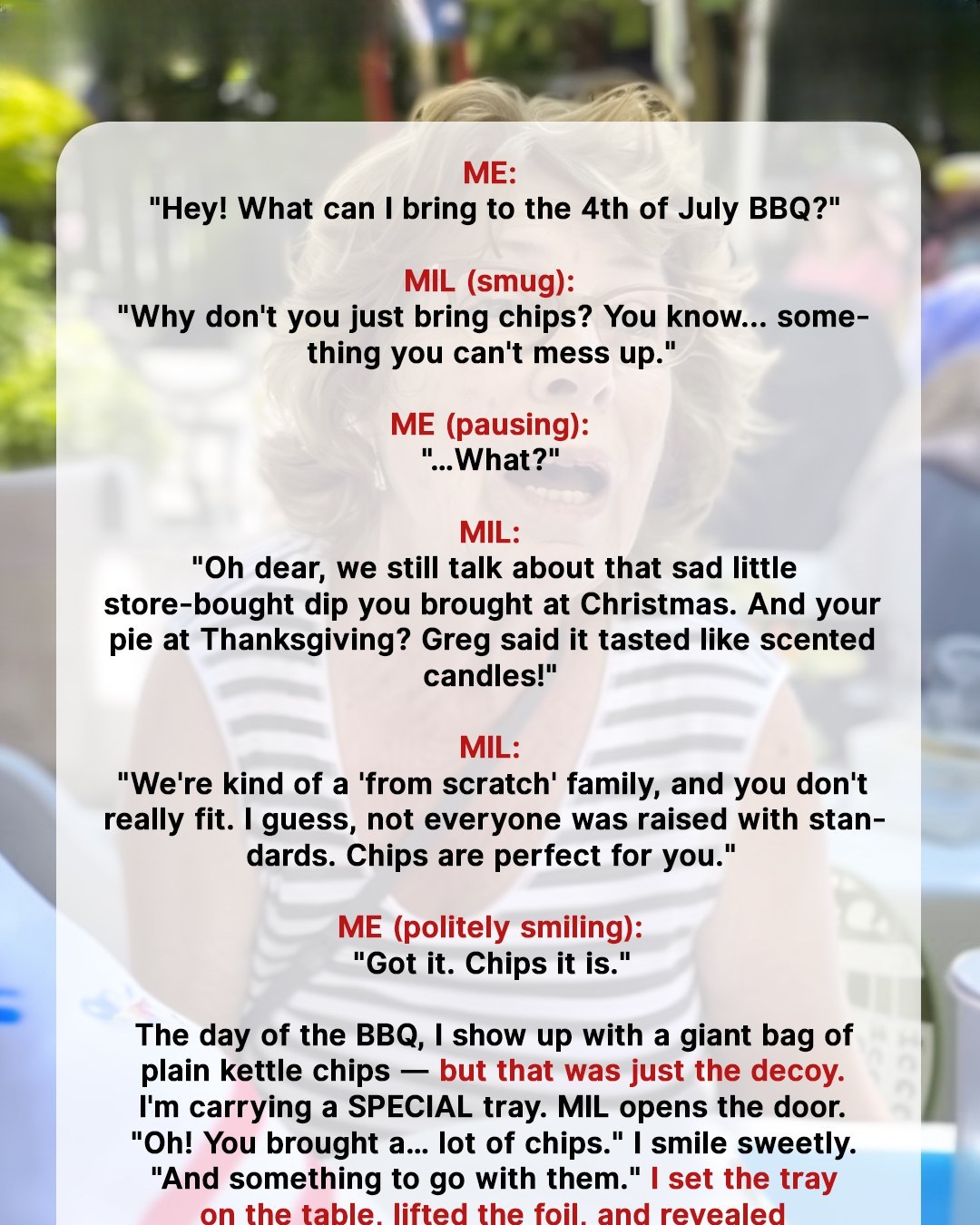 At the BBQ, the moment I unveiled my chip cones, the crowd went wild. Guests swarmed the tray, asking for the recipe and snapping photos. I played it cool, popping one into my mouth while my MIL’s smile stretched thinner by the minute. When someone complimented her “famous” berry tart, I casually pulled out the receipts I’d found in her trash store-bought, both of them. The tart and the cobbler. Her face turned a glorious shade of red.
