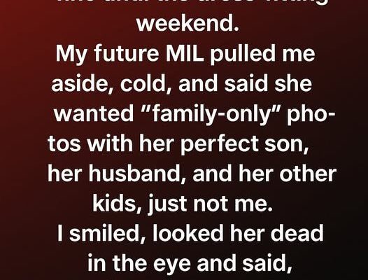 Our wedding is a month away and everything was fine until the dress-fitting weekend. My future MIL pulled me aside, cold, and said she wanted “family-only” photos with her perfect son, her husband, and her other kids, just not me. I smiled, looked her dead in the eye and said, “Of course — but then we’ll take our own photos afterward with the family I am building, too.” Her expression didn’t change, but the room suddenly felt heavier, as if everyone understood what her comment really meant.