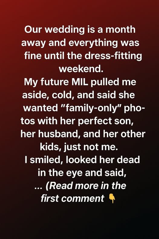 Our wedding is a month away and everything was fine until the dress-fitting weekend. My future MIL pulled me aside, cold, and said she wanted “family-only” photos with her perfect son, her husband, and her other kids, just not me. I smiled, looked her dead in the eye and said, “Of course — but then we’ll take our own photos afterward with the family I am building, too.” Her expression didn’t change, but the room suddenly felt heavier, as if everyone understood what her comment really meant.